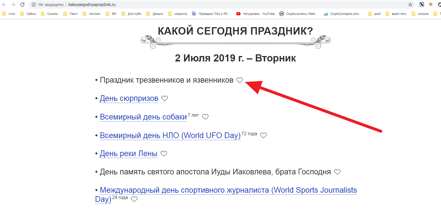 На данном изображении представлен скриншот веб-страницы сайта kakoysegodnyaprazdnik.ru. Основной контент страницы – это список праздников, отмечаемых 2 июля 2019 года. Визуально страница оформлена в светлых тонах с использованием иконок и сердечек рядом с названиями праздников. В верхней части страницы расположен заголовок с датой и днем недели. Список праздников включает такие события, как Праздник трезвенников и язвенников, День спортивных игр, Всемирный день собаки и другие. Страница имеет стандартную структуру веб-сайта с навигационным меню и другими элементами интерфейса.